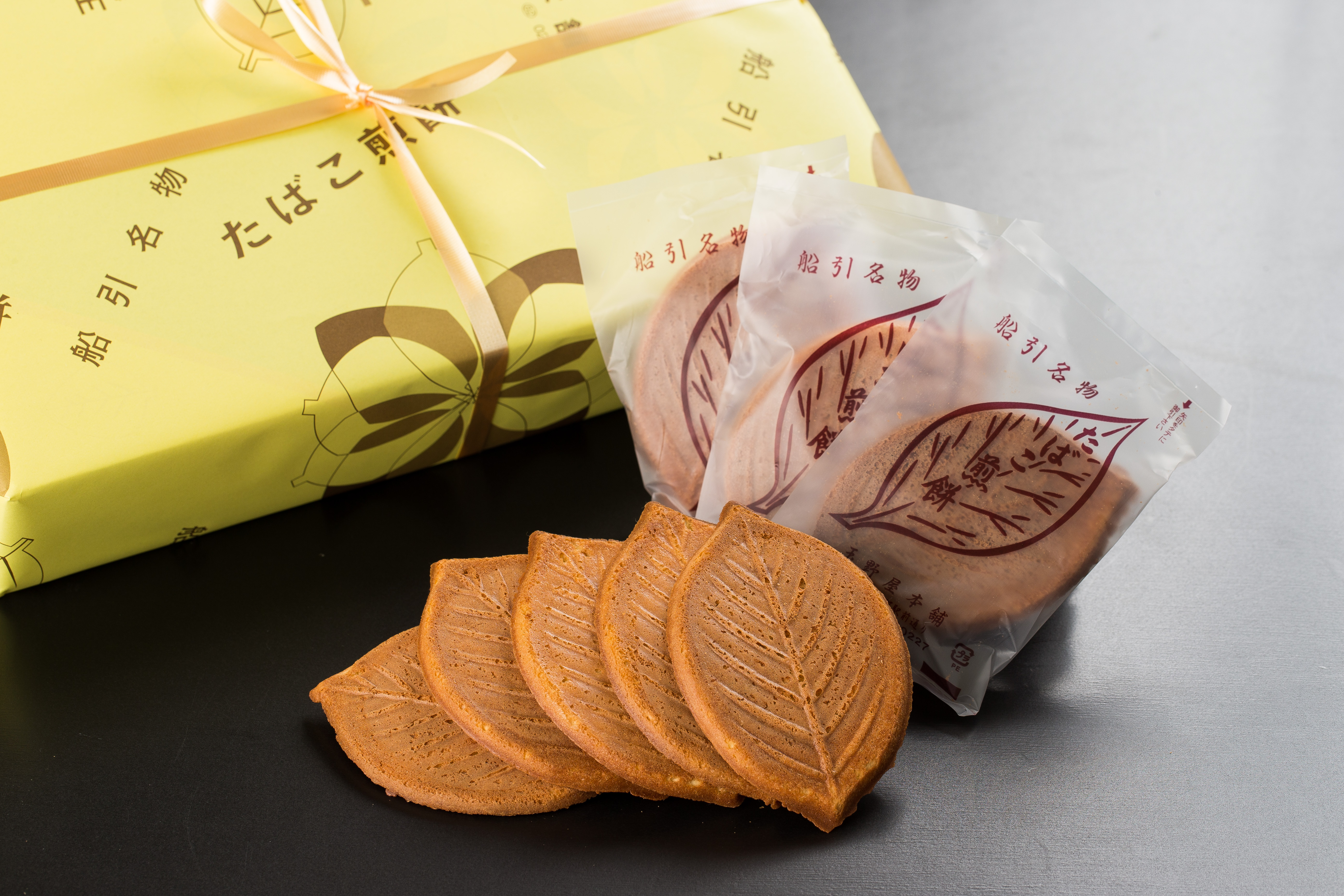 「たばこ煎餅」はかつて全国一の生産量を誇った船引町の名産「葉たばこ」を謹製にした商品です。新鮮なバター・鶏卵・蜂蜜を豊富に使用し、1枚1枚こころをこめて焼き上げた手焼きの高級煎餅です。