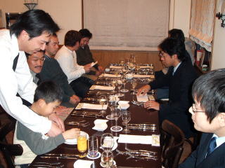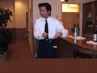 はやる気持ちを抑えつつ、 食事の前に当然講習です。本日の講師は店主の阿部さん。さすがにさまになっています。 いいかお前ら!フレンチって言うのはな・・・ ナイフはこうやって持って・・・ フォークは・・・ 冗談です。丁寧にわかりやすく教えていただきました。ありがとうございました。 |